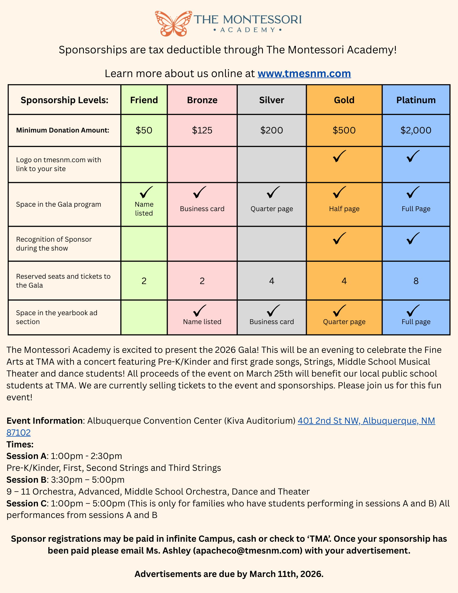 The Montessori Academy is excited to present the 2026 Gala, an evening dedicated to celebrating the Fine Arts at TMA on March 25, 2026. The event will feature performances by our Pre-K-First Grade performers, 2nd-8th Grade Strings/Orchestra, and our Middle School Musical Theater and Dance students.